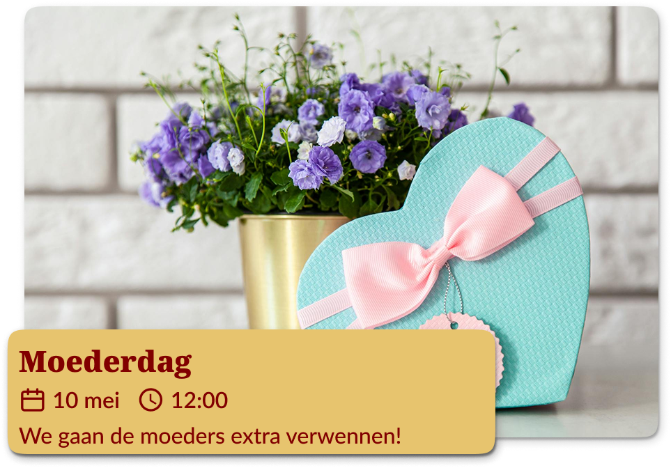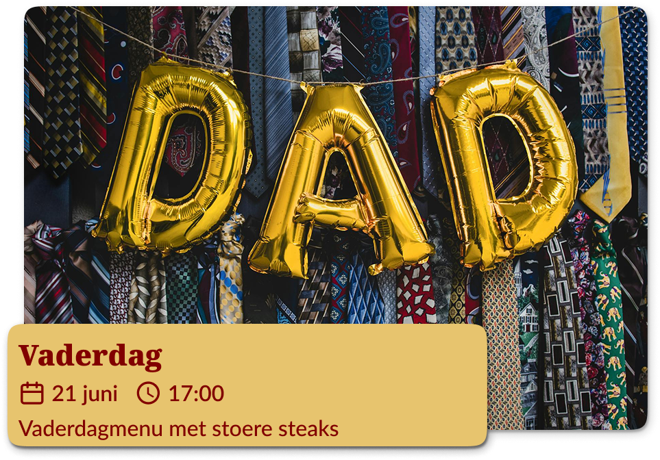 - 28-02 t/m 04-03: Rondom carnaval is het reguliere eetcafé gesloten van de dinsdag vooraf t/m de donderdag erna. Zie onze evenementenkalender voor het Carnavalsrooster